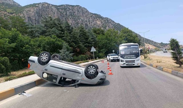 Isparta'nın Eğirdir ilçesinde, sürücüsünün virajda direksiyon hakimiyetini kaybetmesi sonucu bordür taşına çarpan otomobil takla attı. Kazada sürücü yaralandı.