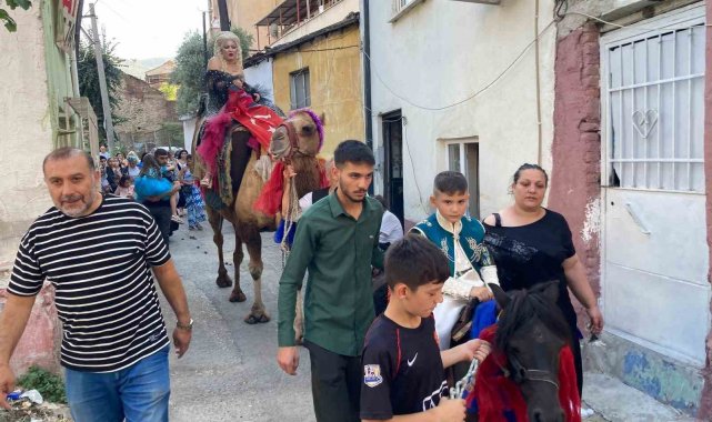 Bursa'da bir sünnet düğününde sünnet çocuğu Midilli cinsi atla mahalle turuna çıkarken, annesi ise deveye binerek oğluna eşlik etti.