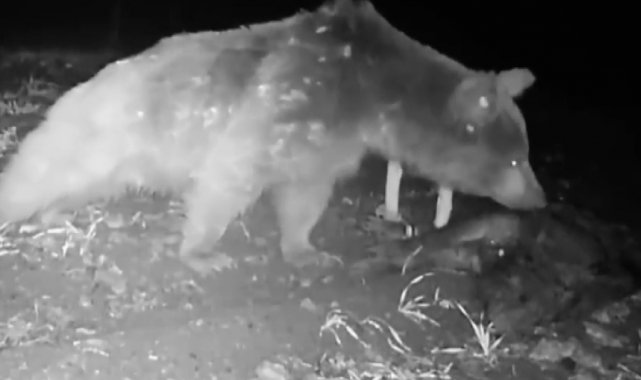 Erzincan'da domuz leşiyle karnını doyuran boz ayı fotokapanla görüntülendi.