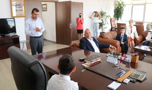 Ziyarette öğrencilerle yakından ilgilenen Başkan Özel, 23 Nisan'ın anlam ve önemine dair sohbet gerçekleştirdi. Ardından temsili olarak belediye başkanlığı görevini 4. sınıf öğrencisi Sümeyye Nisa Yıldırım'a devretti. Başkanlık koltuğuna oturan Sümeyye, görevini ciddiyetle üstlenerek ilçeye dair öneri ve taleplerini sıraladı. Belediye birim müdürlerinin hazır bulunduğu görüşmede, Sümeyye'nin talimatları dikkatle not alındı. Sümeyye Başkan, ilçedeki pazarcı esnafının elmalarının çürüdüğünü belirterek, "Bozdoğan'a soğuk hava deposu yapılmalı. Elmalar çöpe gitmesin" talimatını verdi.