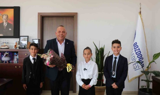 23 Nisan Ulusal Egemenlik ve Çocuk Bayramı kapsamında Bozdoğan Merkez İlkokulu öğrencileri Murat Bozyiğit, Ege Aksaraylı ve Sümeyye Nisa Yıldırım, öğretmenleriyle birlikte Bozdoğan Belediye Başkanı Mustafa Galip Özel'i makamında ziyaret etti.