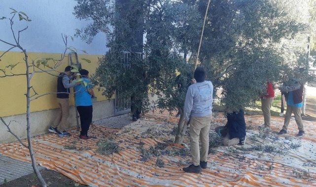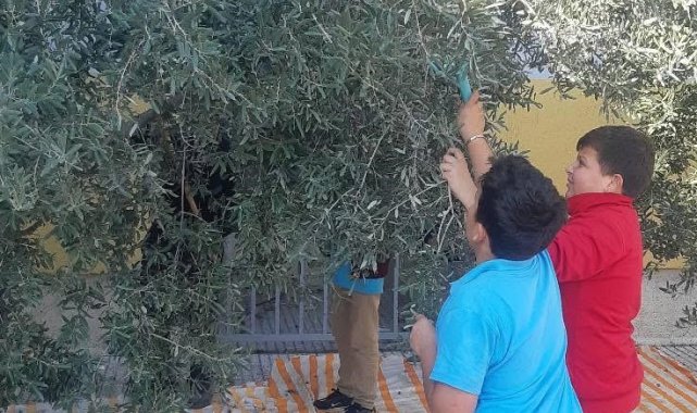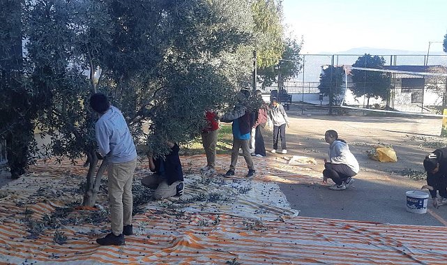 Aydın Bozdoğan ilçesinde öğrenciler, okul bahçesindeki zeytin ağaçlarında hasat yaptı.