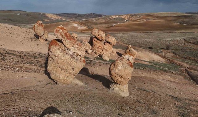 Sivas'ın Kangal ilçesine 20 kilometre uzaklıkta olan Sarıpınar köyü, sınırlarında bulunan ilginç kayalarıyla dikkat çekiyor. Uçsuz bucaksız tarım arazisi içerisinde boş arazide bulunan ilginç kayaların nasıl oluştuğu merak ediliyor. Yüksekliği 5 metreyi aşan kayaların çapı 2 ila 4 metre arasında değişiyor. Bozkırın ortasındaki esrarengiz kayalar, görüntüleri kadar rivayetiyle de dikkat çekiyor. Bir rivayete göre; köyde yaşayan bir erkek aynı köyden bir kızı sevmiş. Ancak kız başkası ile evlenmiş. Kızın evleneceği gün düğün alayının bölgeden geçtiği sırada oğlan 'taş olasınız' diyerek beddua etmiş. Düğün alayı da oracıkta taş kesilmiş. Dron ile havadan da görüntülenen kayalar, turizme kazandırılmayı bekliyor.
