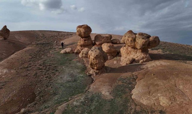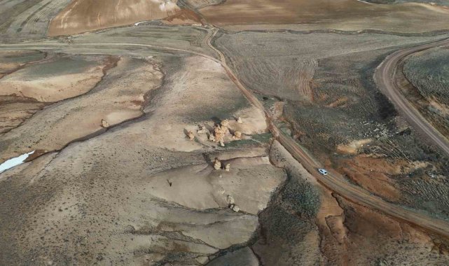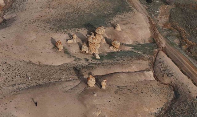 Sivas'ta bozkırın ortasında bulunan ve yapısı ile dikkat çeken kayalar, merak konusu oldu. Neden oluştuğu bilinmeyen devasa kayalar, dron ile havadan görüntülendi.