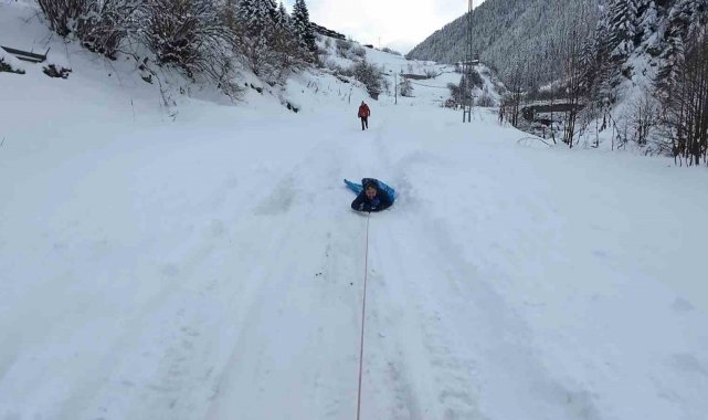 Rize'de şiddetli kar yağış kenti beyaza bürüdü. Yaylalarda 1 metreyi aşan kar fotoğraf tutkunlarına kartpostallık görüntüler verirken adrenalin tutkunlarına da keyifli dakikalar yaşattı. Adrenalin tutkunu Oğuz Bal ve Volkan Aytaç isimli 2 arkadaş, yağan karı fırsat bilerek Rize'nin İkizdere ilçesindeki Sivrikaya Yaylası'na çıktı. 4x4 araçlarının arkasına bir ip vasıtası ile branda bağlayan 2 kafadar, yanlarında bulunan diğer arkadaşlarından aracı sürmesini rica etti. Brandanın üzerinde oturan 2 kafadar arabanın da kendilerini çekmesiyle karda kayarak keyifli anlar yaşadı. Sürücü olan arkadaşlarına 'biraz yavaş gitsene vicdansız' diye seslenseler de bununla da yetinmeyen ikili bu kez brandanın üzerinde ayağa kalktı. Ayakta da kaymayı başaran Aytaç ve Bal'ın o anları renkli görüntülere sahne oldu.