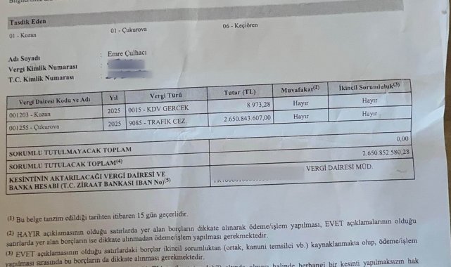 Kozan ilçesinde yaşayan Avukat Emre Çulhacı, adına 2 milyar 650 milyon 843 bin 607 lira tutarında trafik cezası kaynaklı vergi borcu göründüğünü öğrenince hayatının şokunu yaşadı. Türkiye'de geçen yıl kesilen toplam trafik cezalarının yaklaşık 30'da birine denk gelen rakam karşısında şoku atlatan avukat Çulhacı, yaptığı görüşmelerle hatayı düzelttirdi.