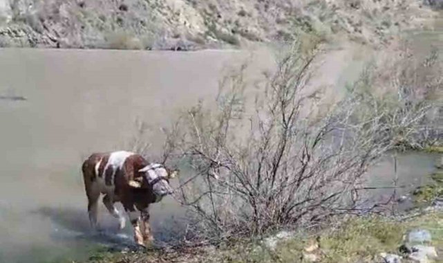 Elazığ'ın Palu ilçesinde Murat Nehri'ne giren ve bir adada mahsur kalan tosun, balıkçı Memet Şekerci ve arkadaşları tarafından kelek yardımıyla kurtarıldı.