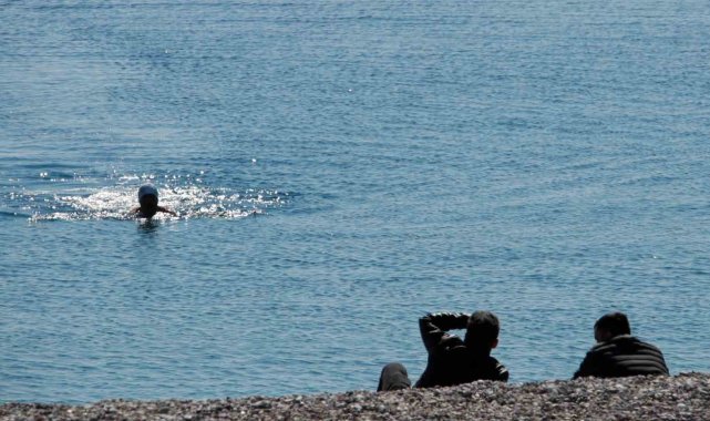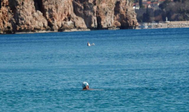 Son iki gündür soğuk hava etkisindeki Antalya'da bazı vatandaşlar ve yabancı turistler ısınmak için sıcaklığı 18 derece olan denize girdi.