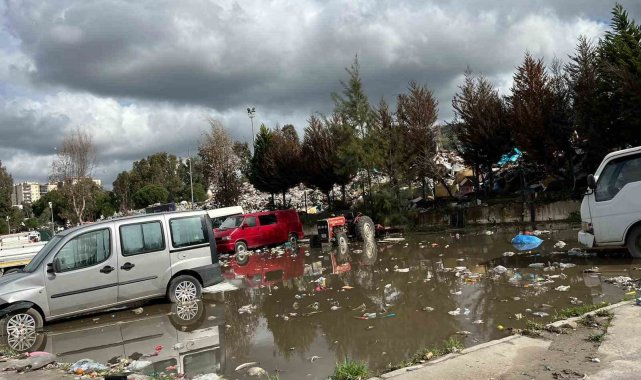 İzmir'de etkili olan sağanak yağışın ardından Buca Belediyesi Temizlik İşleri Müdürlüğü Şantiyesinde toplanan çöpler yola dağıldı. Çöp depolama alanından gelen sular ise otoparkta birikti ve bazı araçlar çöp sularının içerisinde kaldı.