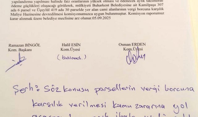 Açıklamada ayrıca, CHP'li Meclis Üyesi'nin komisyon raporuna şerh koyarak söz konusu arsaların borca karşılık devri yerine ihale yoluyla satılmasını savunduğu ifade edildi. Konuya ilişkin değerlendirmede bulunan Buharkent Belediye Başkanı Mehmet Erol, şu ifadeleri kullandı: "Bizim tercihimiz, belediye mülkiyetindeki bu arsaların milletin malı olarak yine devlette kalması yönündedir. Biz cami arsalarının, bu arsaları belki de yüz yıldır kullanan Devletin Maliye Hazinesi'ne devrini uygun bulduk. CHP'li meclis üyeleri ise cami arsalarının üçüncü kişilere satışını talep etmiştir. Kamuoyunun bu konuda yanlış yönlendirilmesini doğru bulmuyoruz."