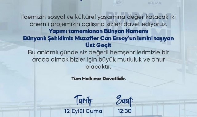 Yapımı tamamlanan Bünyan Hamamı ile Bünyanlı Şehidimiz Muzaffer Can Ersoy'un ismini taşıyan Üst Geçit, 12 Eylül Cuma günü halkın kullanımına açılacak. Belediye yetkilileri, açılış töreninde hemşehrilerle bir arada olmaktan büyük mutluluk duyacaklarını ifade etti. Tören, saat 12:30'da gerçekleştirilecek.