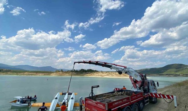 Burdur'da barajdan su almak için deneme uçuşu yaptığı sırada kaza kırıma uğrayıp ters dönen uçak vinç yardımıyla bulunduğu yerden çıkarıldı.
