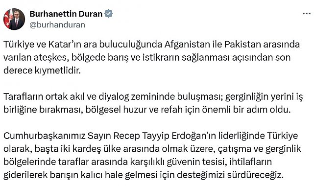 Cumhurbaşkanlığı İletişim Başkanı Burhanettin Duran, Türkiye ve Katar'ın arabuluculuğunda Afganistan ile Pakistan arasında varılan ateşkesin, bölge barışı açısından son derece kıymetli olduğunu vurguladı.
