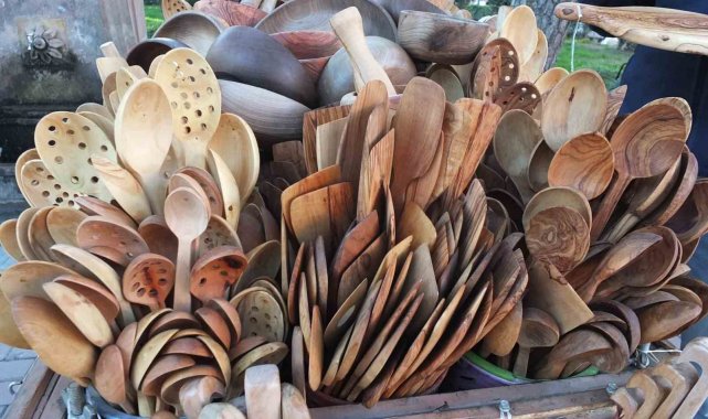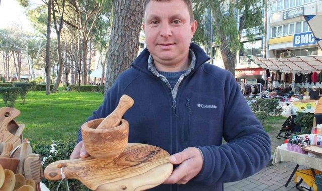 Burhaniye ilçesinde, zeytin ağaçlarından yapılan mutfak gereçleri ilgi gördü. Ağaç işlerinin dede mesleği olduğunu kaydeden 34 yaşındaki Musa Bozkurt, değişik pazarlarda ürünlerini sattığını söyledi.
