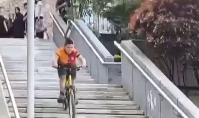 Bursa'nın tarihi Tophane semtinde 10 yaşlarındaki bir çocuk, bisikletiyle dik merdivenlerden indi. Görenleri hayrete düşüren cesur hareket, çevredeki vatandaşlar tarafından alkışlarla desteklendi. Minik bisikletlinin o anları ise kameralara yansıdı.