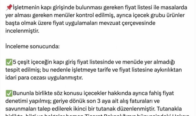 "Sosyal medyada yer alan; Mudanya'daki bir işletmede 3 adet su için 600 TL ödeme yapıldığına ilişkin paylaşım üzerine, Bursa Valiliğimiz uhdesinde, Bursa Ticaret İl Müdürlüğümüzce, 17.02.2026 tarihinde, derhal yerinde denetim gerçekleştirilmiştir. Yapılan denetimde; işletmenin kapı girişinde bulunması gereken fiyat listesi ile masalarda yer alması gereken menüler kontrol edilmiş, ayrıca içecek grubu ürünler başta olmak üzere fiyat uygulamaları mevzuat çerçevesinde incelenmiştir. İnceleme sonucunda; 5 çeşit içeceğin kapı giriş fiyat listesinde ve menüde yer almadığı tespit edilmiş; bu nedenle işletmeye tarife ve fiyat listesine aykırılıktan idari para cezası uygulanmıştır. Bununla birlikte söz konusu içecekler hakkında ayrıca fahiş fiyat denetimi yapılmış; geriye dönük son 3 aya ait alış faturaları ve savunmaları talep edilerek ikinci bir tutanak düzenlenmiştir. Tutanakla birlikte bilgi ve belgeler, Ticaret Bakanlığımız bünyesindeki Haksız Fiyat Değerlendirme Kurulu'na gereği yapılmak üzere iletilmiştir. Yeme içme sektörü başta olmak üzere görev alanımıza giren tüm konularda hem rutin hem de şikâyet üzerine denetimlerimizi kesintisiz sürdürüyor; tüketicilerimizin haklarını korumak ve piyasada adil fiyat uygulamasını temin etmek için gereken tüm idari işlemleri kararlılıkla uyguluyoruz."