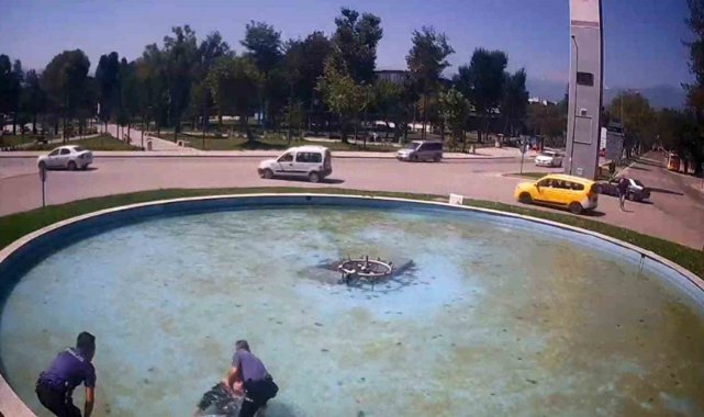 Bursa'nın İnegöl ilçe merkezinde bulunan süs havuzuna düşen alkollü şahıs, polis ekiplerinin hızlı müdahalesiyle boğulmaktan son anda kurtarıldı. Şahsın boğulmak üzere olduğu ve polis ekiplerinin kurtardığı anlar bir işyerinin güvenlik kamerasına saniye saniye yansıdı.