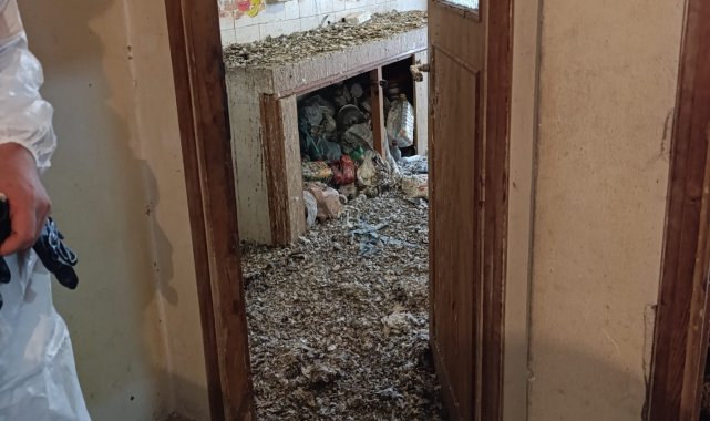 Evin cam ve kapılarının uzun süredir açık olduğu, odaların kuşlarla dolduğu ve dairenin adeta kümese döndüğü görüldü. Temizlik sonrası ekipler evde ilaçlama ve dezenfekte çalışması gerçekleştirdi.