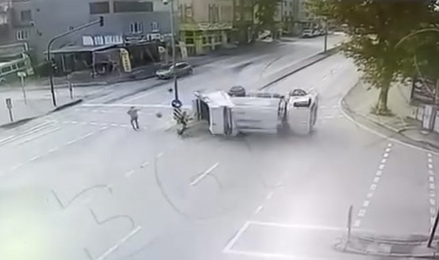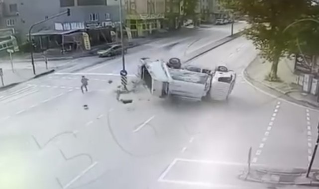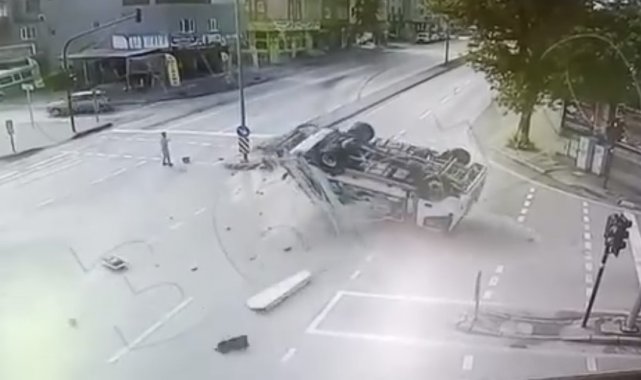 Bursa'nın Yıldırım ilçesinde sabah saatlerinde seyir halindeki çöp kamyonu kontrolden çıkarak refüje girdi. Çarpmanın etkisiyle takla atan kamyon ters dönerken, ortalık savaş alanına döndü. Kaldırımda bekleyen bir vatandaş ise kazayı kıl payı atlattı. Kazayı gören vatandaşlar sürücünün yardımına koşarken, o anlar güvenlik kamerasına saniye saniye yansıdı.