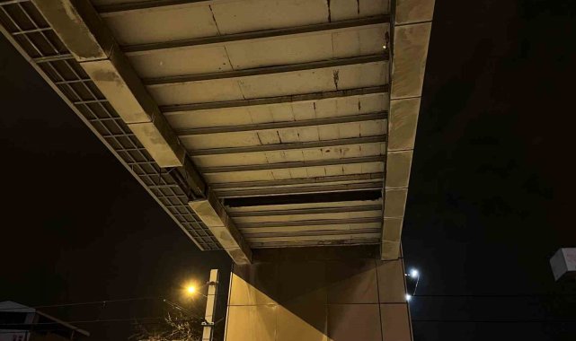 Bursa'da seyir halindeki araçların bulunduğu yola, üst geçitten kopan bağlantı demiri düştü. Olayda büyük bir facia kıl payı atlatılırken, bir aracın iki lastiği parçalandı.