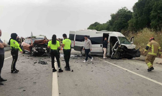 Bursa'nın Gemlik ilçesinde minibüs ile otomobilin kafa kafaya çarpıştığı kazada 2'si ağır 12 kişi yaralandı. Kaza yerinde iki taraf birbirine girerken, olayı polis ekipleri güçlükle ayırdı.