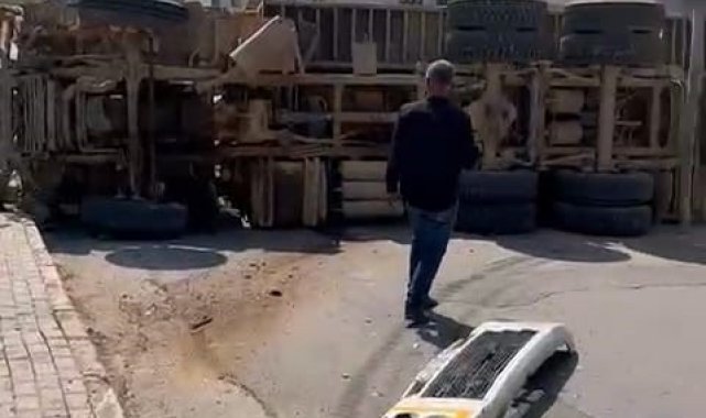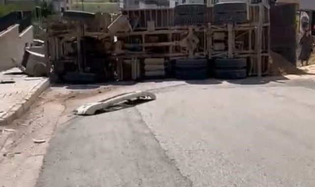 Bursa'nın İnegöl ilçesinde freni patlayan kum yüklü kamyon, sitenin duvarına çarpıp devrildi. Sürücünün yaralandığı kazada bir vatandaş ise saniyelerle kurtuldu.