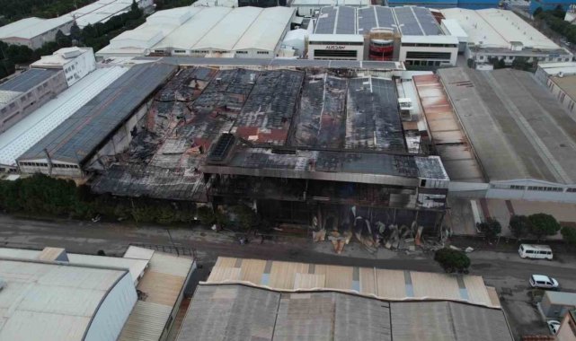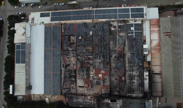 Bursa'da gece alevlere teslim olan fabrika sabahın ilk ışıklarıyla havadan görüntülendi