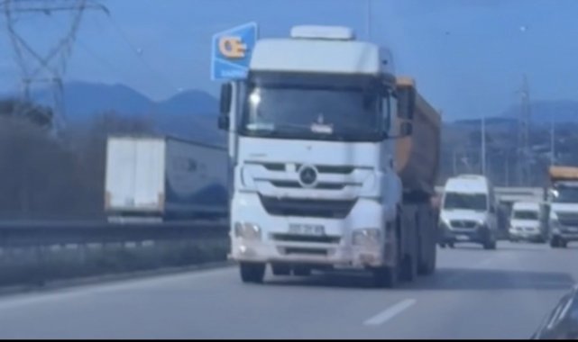 Bursa Çevre Yolu'nda seyir halinde olan bir hafriyat kamyonu, uzun araçların geçişine yasak olan en sol şeride girerek bir süre ilerledi. Kamyon sürücüsü trafik güvenliğini tehlikeye düşürerek, süratli şekilde yoluna devam etti.