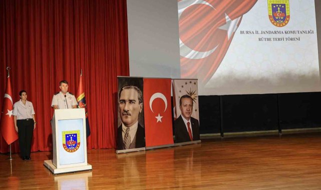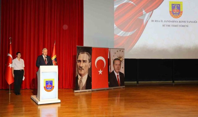 Bursa İl Jandarma Komutanlığı'nda görev yapan personelin rütbe terfi töreni, Bursa Valisi Erol Ayyıldız, il protokolü ve personelin ailelerinin katılımıyla gerçekleştirildi. Uludağ Üniversitesi Prof. Dr. Mete Cengiz Kültür Merkezi'nde düzenlenen törende bir üst rütbeye yükselen jandarma personeline yeni rütbeleri takdim edildi. Terfi eden personeli tebrik eden Vali Ayyıldız, jandarmanın fedakârca görev yaptığını vurgulayarak başarılarının devamını diledi.