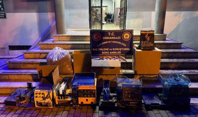 Bursa Emniyet Müdürlüğü ekipleri tarafından iki ayrı iş yerine yapılan baskında, sigara sarım makineleri, dolu makaronlar, kaçak sigaralar ve tütün ürünleri bulundu. Operasyonda toplam 4 adet sigara sarım ve dolum makinası, 22 bin 300 adet tütün doldurulmuş makaron sigara, bin 200 paket kaçak sigara, 18 kilogram kıyılmış tütün, 60 adet elektronik sigara likiti ve 7 paket kaçak nargile tütünü ele geçirildi. Ayrıca iş yerlerinden birinin ruhsatsız olarak faaliyet gösterdiği belirlendi.