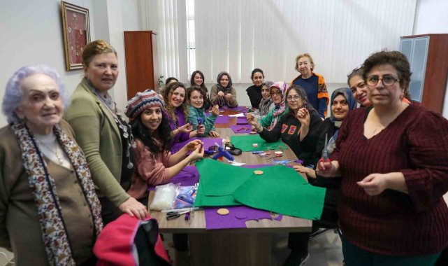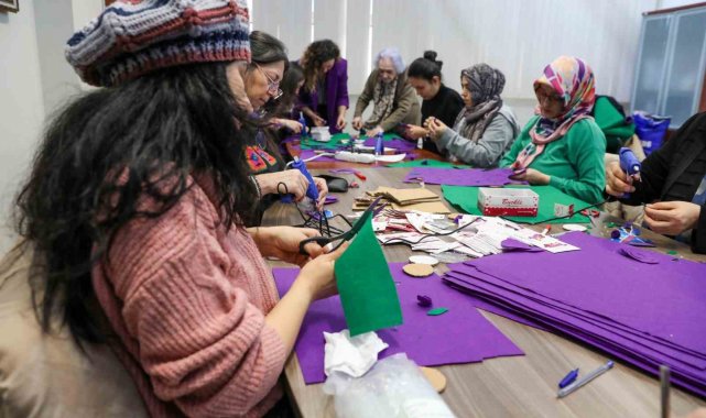Bursa Kent Konseyi Kadın Meclisi'nde gerçekleştirilen atölye çalışmasında, keçe kumaşlar, renkli iplikler, düğmeler ve süsleme malzemeleri kullanılarak birbirinden renkli ürünler hazırlandı. Kadınların dayanışma ve ortak üretim gücünü bir kez daha ortaya koyan ürünler, 8 Mart Pazar günü yapılacak yürüyüşte kullanılacak.