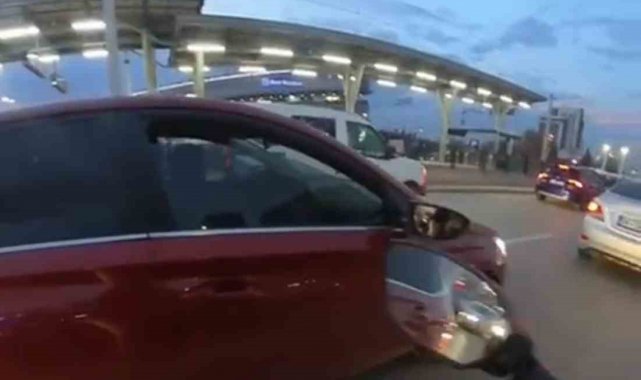 Bursa'da kadın motosiklet sürücüsü ile kadın otomobil sürücüsü arasında yol verme nedeniyle başlayan tartışma, kısa sürede büyüyerek kavgaya dönüştü. Yaşanan arbede sırasında otomobil sürücüsü motosikletliye çarparken, motosiklet sürücüsü ise öfkesine hakim olamayarak aracın aynasına vurdu. Olay anı kask kamerasına anbean yansıdı.