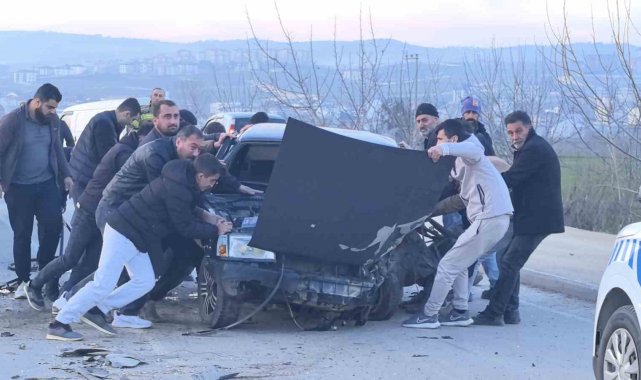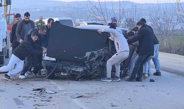 Bursa'nın İnegöl ilçesinde kamyonla kafa kafaya çarpışan otomobilde sıkışan sürücü, çevredeki vatandaşlar tarafından sıkıştığı yerden kurtarıldı.