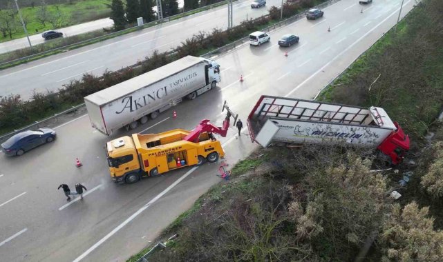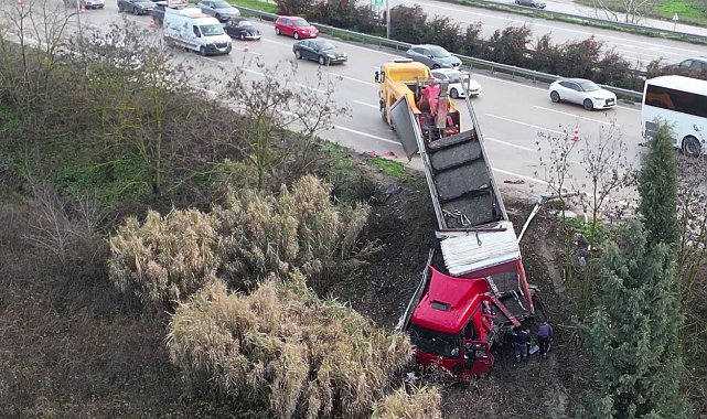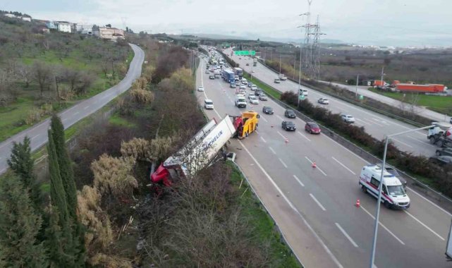 Bursa'da kontrolden çıkan tır refüje uçtu. Facianın teğet geçtiği kazada sürücü yaralanırken, otobanda trafik uzun kuyruklar oluşturdu.