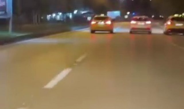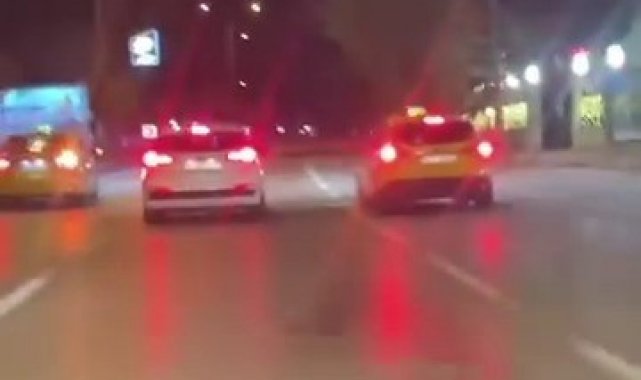 Öte yandan, yaşanan kovalamacada taksiden inen bir kişinin ise, korsan taşımacılık iddiası ile kovaladıkları şahsın aracına tekme atmaya çalışması kameraya anbean yansıdı.