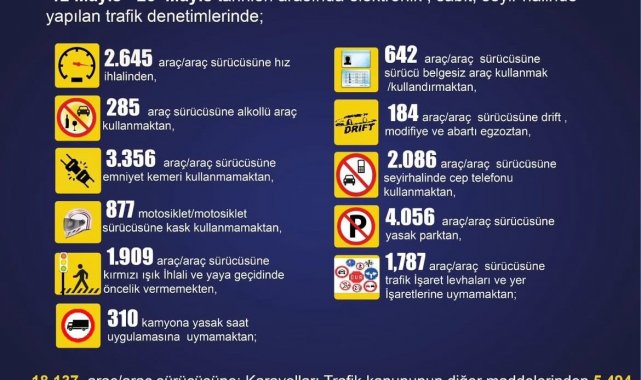 Bursa Emniyet Müdürlüğü'nün iki haftalık ceza bilançosu şöyle: "3 bin 356 sürücüye emniyet kemeri, 4 bin 56 sürücüye yasak yere park etmekten, 2 bin 86 sürücüye araç kullanırken cep telefonu ile konuşmaktan, 1 bin 909 sürücüye kırmızı ışık ihlali yapmaktan veya yaya geçidinde yayalara öncelik vermemekten, 877 motosiklet sürücüsüne kask takmamaktan, 285 sürücüye alkollü araç kullanmaktan, 642 kişiye belgesiz araç kullanmaktan, 184 sürücüye drift yapmaktan, modifiye ya da abartı egzoz kullanmaktan, 310 kamyon sürücüsü yasak saatlerde trafiğe çıkmaktan, 2 bin 645 sürücüye hız limitlerini aşmaktan, 1 bin 787 sürücüye ise trafik işaret ve levhalarına uymamaktan idari ceza uygulandı"