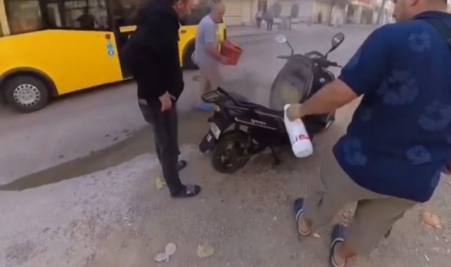 Bursa'da park halindeki bir motosiklet, bir anda alev topuna döndü. O sırada olay yerinde bulunan bir vatandaş, eline geçirdiği vileda kovasını kaptığı gibi suyla motoru söndürdü. O anlar kameraya yansıdı.