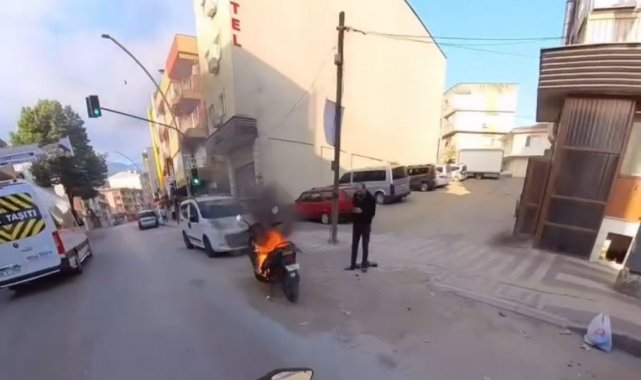 Olay merkez Kestel ilçesinde meydana geldi. Edinilen bilgiye göre, park halindeki motosiklet aniden alev almaya başladı. Alevlerin sardığı motoru gören çevredekiler etrafta yangın tüpü ararken, bir vatandaş vileda kovasına doldurduğu suyla alevlere müdahale etti. O anlar kameraya yansırken, ihbar üzerine olay yerine itfaiye ve polis sevk edildi. Polis olayla ilgili tahkikat başlattı.