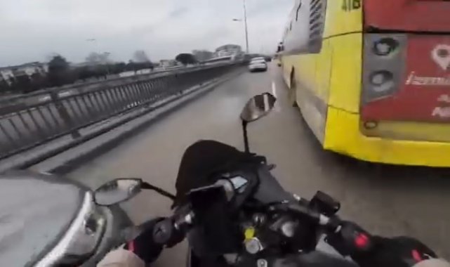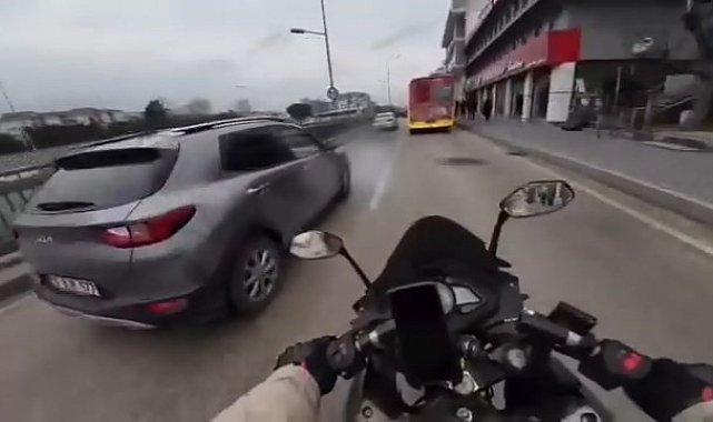 Olay, merkez Yıldırım ilçesi Ankara yolu üzerinde meydana geldi. Biranda hızlanan motosiklet sürücüsü, otobüse çarpmamak için solundan giden otomobilin önüne geçtiği an direksiyon hakimiyetini kaybetti. Sağa ve sola doğru yalpalayan motosiklet, sürücüsü kısa bir süre sonra direksiyonu toplamasıyla yoluna devam etti. Yaşanan korku dolu anlar, motosikletlinin kask kamerasına yansıdı.