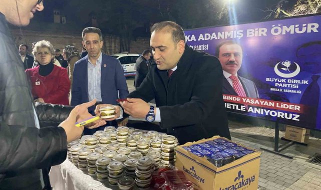 Büyük Birlik Partisi (BBP) Bursa İl Başkanlığı tarafından, merhum BBP Kurucu Genel Başkanı Muhsin Yazıcıoğlu'nun vefatının 17'nci yıl dönümü dolayısıyla Ulucami'de mevlid programı düzenlendi. Programa partililer, Alperen Ocakları mensupları ve vatandaşlar katıldı. Muhsin Yazıcıoğlu için dualar edilirken, geleneksel olarak helva dağıtımı da gerçekleştirildi. BBP yöneticileri yaptıkları konuşmalarda Yazıcıoğlu'nun fikirlerinin ve mücadelesinin