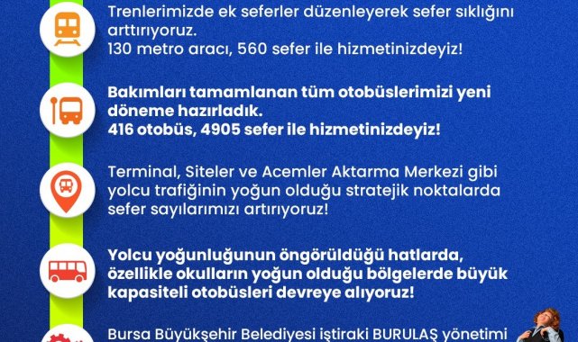 Bursa Büyükşehir Belediyesi, yeni eğitim ve öğretim yılı öncesinde toplu ulaşımda yaşanabilecek yoğunluğu önlemek için bir dizi tedbiri uygulamaya alıyor. Raylı sistemler hatlarına paralel güzergahlarda otobüs seferleri devreye alınırken, 416 otobüs toplam 4 bin 905 sefer yaparak vatandaşların hizmetinde olacak.