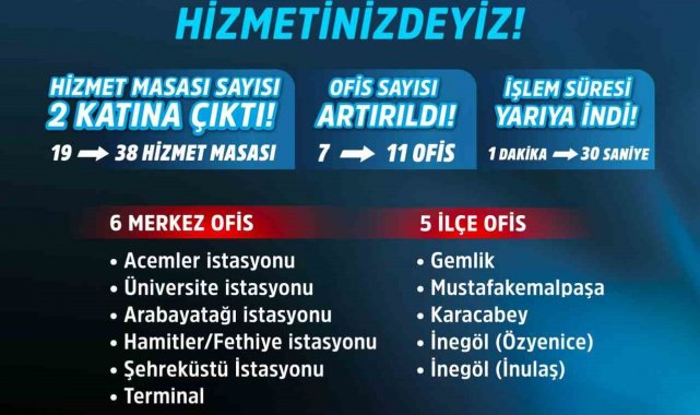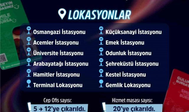 Öte yandan ulaşım hizmetlerini daha güvenli ve hızlı hale getirmek için BursaKart sistemindeki yenileme süreci tüm hızıyla devam ediyor. Tam BursaKart değişimleri için 5 olan Cep Ofis sayısı 12'ye, hizmet masası sayısı ise 20'yı çıkartıldı. Tam Kartların değişimleri Osmangazi, Acemler. Üniversite, Arabayatağı, Hamitler, Terminal, Küçüksanayi, Emek, Odunluk, Şehreküstü, Kestel ve Gemlik istasyonlarındaki cep ofislerinde sıra beklemeden yapılabiliyor.