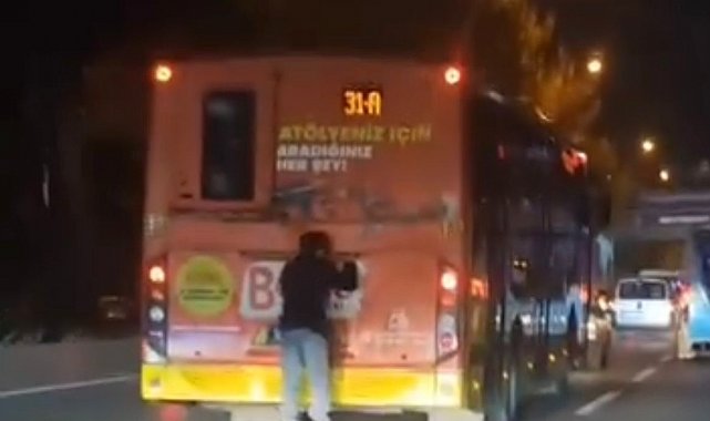 Bir genç, şehir içi ulaşımda kullanılan otobüsün arkasına tutunarak tehlikeli şekilde yolculuk yaptı. Canını hiçe sayan kişi, hem kendi hayatını hem de trafikteki diğer vatandaşların güvenliğini tehlikeye attı.