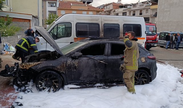 Bursa'nın İnegöl ilçesinde park halindeki otomobilde yangın çıktı. Otomobil küle dönerken, yanındaki cip ile minibüste hasar meydana geldi.