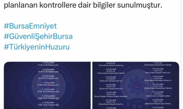 Bursa İl Emniyet Müdürlüğü, il genelinde gerçekleştirilen elektronik, sabit ve seyir halinde yapılan radar denetimlerine ilişkin yeni bir uygulamaya geçti. Buna göre Emniyet Müdürlüğü'nün sosyal medya hesaplarından denetim yapılacak noktalar ve saatleri açıklandı.