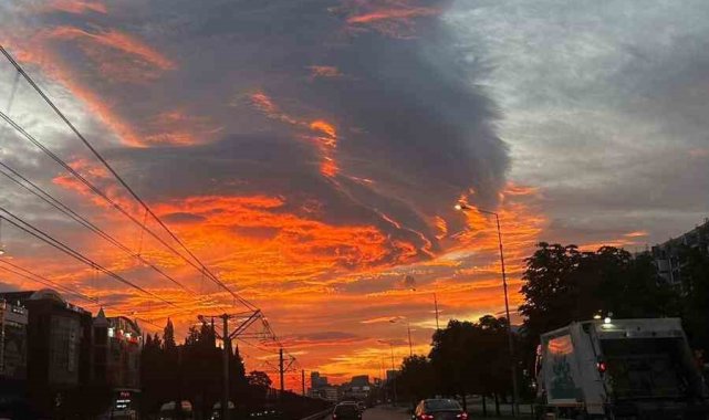 Bursa'da sabah saatlerinde gökyüzünde beliren sıra dışı bulut oluşumu şehrin farklı noktalarından görüntülendi. Gün doğumuyla birlikte turuncu ve kırmızı tonlarına bürünen gökyüzü, adeta kartpostallık manzaralar ortaya çıkardı.