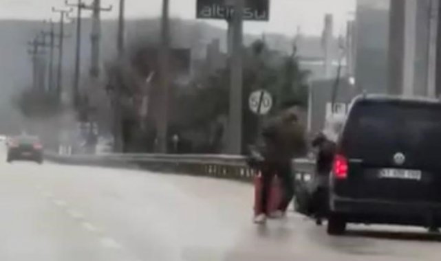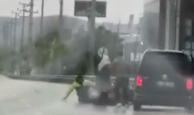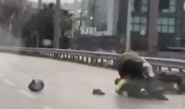 Bursa'nın Kestel ilçesinde seyir halindeki sürücü ile kurye arasında çıkan kavgada tekme ve yumruklar havada uçuştu. Araçtan inen sürücü, motokuryeyi darp ederken, kadınlar olayı ayırmak için var gücüyle çabaladı. Araçtan inen bir çocuk ise o anları şaşkınlıkla izledi.