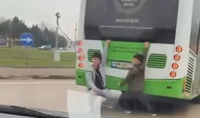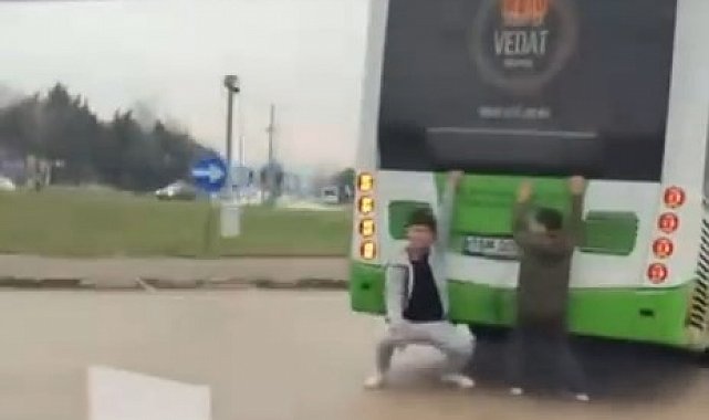 Bursa'da otobüsün arkasına tutunarak ayaklarını yere sürüyen 10-15 yaşlarındaki 2 çocuk, trafikte tehlike saçtı. O anlar cep telefonu kamerasına yansıdı.