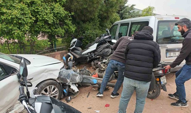 Kaza, saat 18.00 sıralarında İnegöl'ün kırsal Hamzabey mahallesindeki Mobilya İhtisas Organize sanayi bölgesi 17 ile 19. Caddelerin kesiştiği kontrolsüz kavşakta meydana geldi. 17. Cadde üzerinde seyir halinde olan Bayram T. (26) yönetimindeki 34 RY 5266 plakalı otomobil ile 19. Cadde üzerinde seyir halinde olan Özgür Ş. (28) yönetimindeki 16 AEB 817 plakalı otomobil çarpıştı. Çarpışmanın etkisiyle savrulan 34 RY 5266 plakalı otomobil, park halindeki 16 BKD 248, 16 BAM 491, 16 AVC 942, 16 AYH 501 ve 16 BHS 483 plakalı motosikletler ile 16 PH 466 hafif ticari araca çarparak durabildi. Kaza sonucu sürücüler ile 34 RY 5266 plakalı otomobilde yolcu olarak bulunan E.Ö. (17) ve Metin G. (20) yaralandılar. Yaralılar kaza yerine sevk edilen ambulanslarla İnegöl Devlet Hastanesine kaldırıldılar.