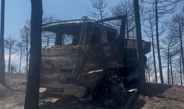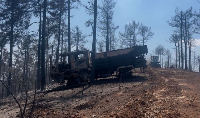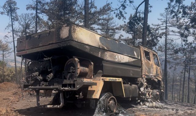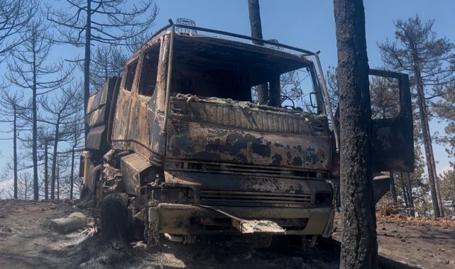 Bursa'nın Harmancık ilçesindeki orman yangınında Orman Genel Müdürlüğü'ne ait bir kamyon alevlerin arasında kalarak küle döndü. Ekipler, yangın bölgesinden son anda kaçarak canlarını zor kurtardı.